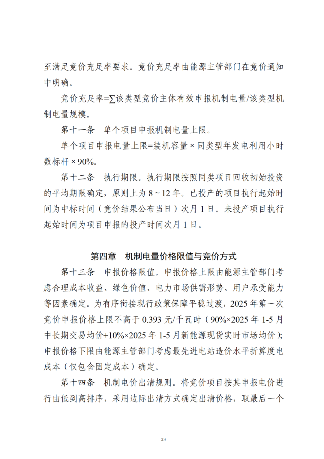 为有序衔接现行政策保障平稳过渡,2025年第一次竞价申报价格上限不高于0.393元/千瓦时(90%×2025年1-5月中长期交易均价+10%×2025年1-5月新能源现货实时市场均价);申报价格下限由能源主管部门考虑最先进电站造价水平折算度电成本(仅包含固定成本)确定。