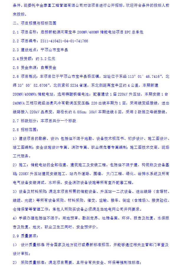 原标题:0.8元/Wh!河南平顶山200MW/400MWh储能EPC招标