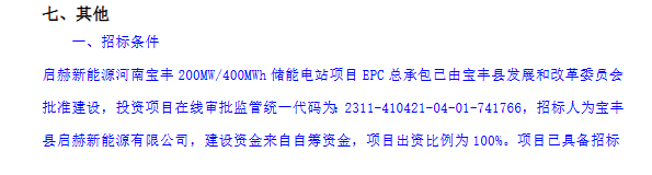 北极星储能网讯:宝丰县启赫新能源有限公司发布河南宝丰200MW/400MWh储能EPC招标公告,项目资金来源为自筹资金32000万元,约合单价0.8元/Wh,项目位于河南平顶山。