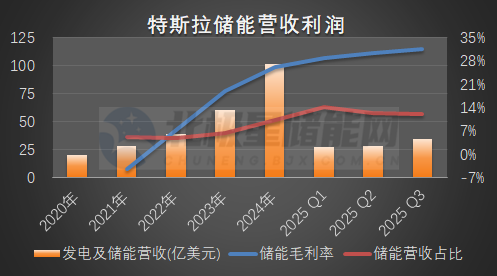 在第三季度,特斯拉的储能营收34.15亿美元、占总营收12.2%,同比增长44%,特斯拉储能的毛利润也以11亿美元创下了单季度最高历史记录,储能业务的毛利率高达31.42%。