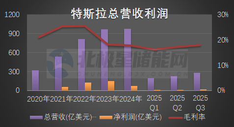 北极星储能网讯:10月22日,特斯拉公布2025年第三季度财报,共实现总营收280.95亿美元,同比增长12%,净利润13.89亿美元,同比降低了37%,归母净利润13.73亿美元,同比降低37%。整体毛利率17.99%,与2024年同期相比降低了9%。