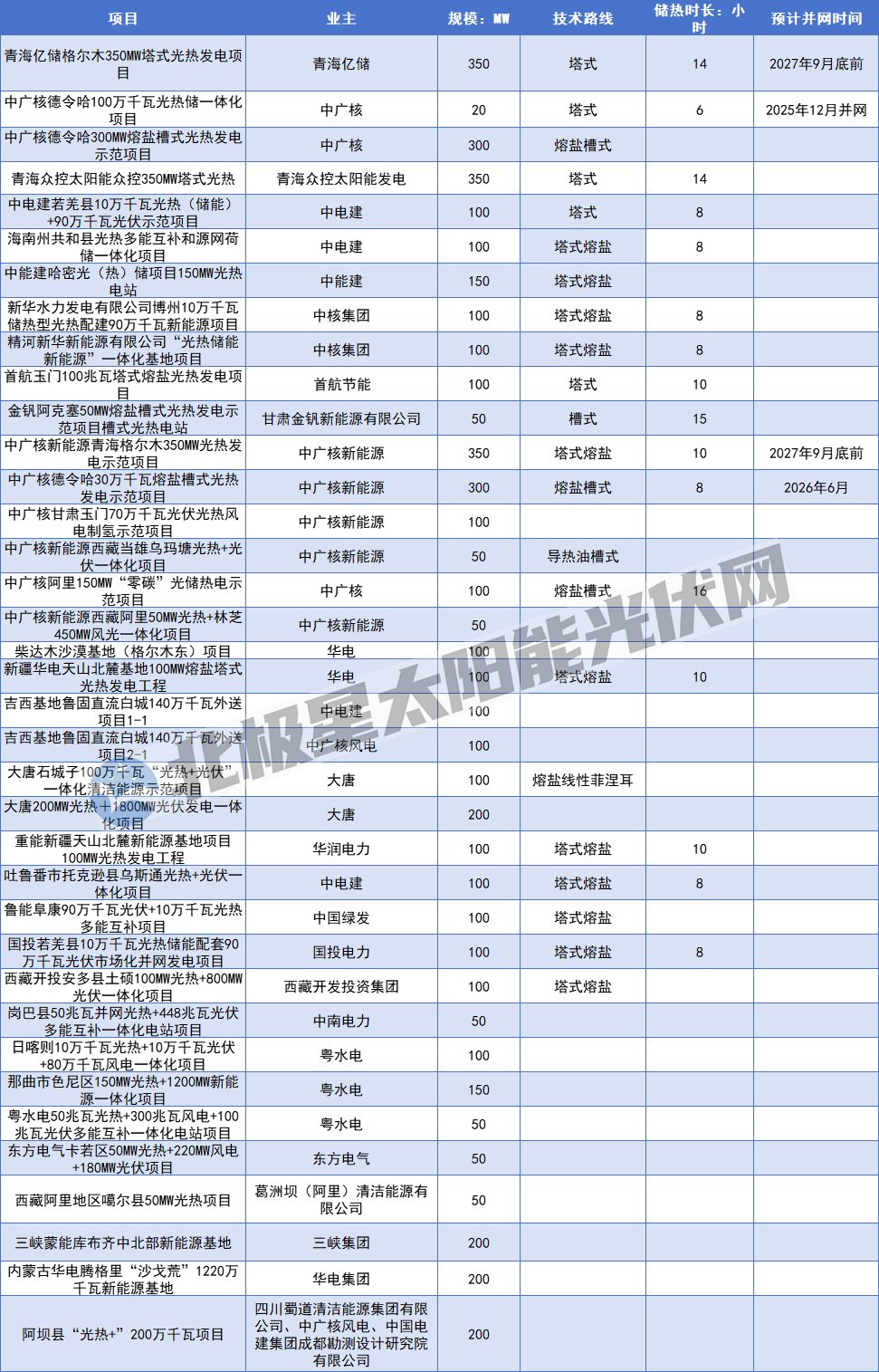 (部分已并网光热发电项目)