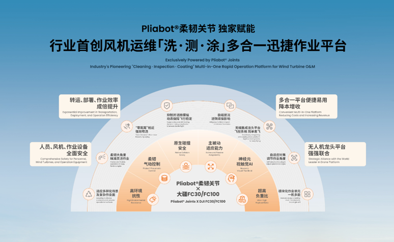 一方面,无人机高空作业,彻底消除了工作人员高空坠落等极端风险,同时大大减轻了恶劣环境对人员带来的影响。另一方面,Pliabot®柔韧关节+触觉AI,可实现作业过程中的设备的动态自适应平衡,同时柔韧结构可主动消解意外碰撞能量,实现无损作业,全面保障风机、作业设备的安全。