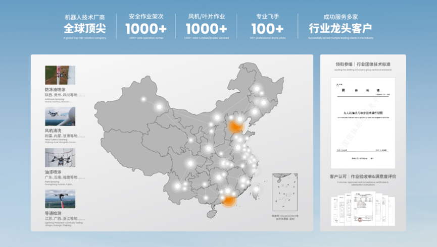 目前,万勋科技风机运维「洗·测·涂」多合一迅捷作业平台服务客户遍布全国各省市,成功服务了国家能源、国电电力等龙头企业,累计完成1000+架次安全飞行作业,覆盖1000+风机/叶片,专业技术与服务能力经受了大量市场检验,广受客户好评。