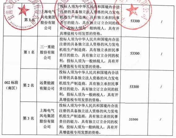 001标段(北区):第一中标候选人:远景能源有限公司,中标价:53300万元。
