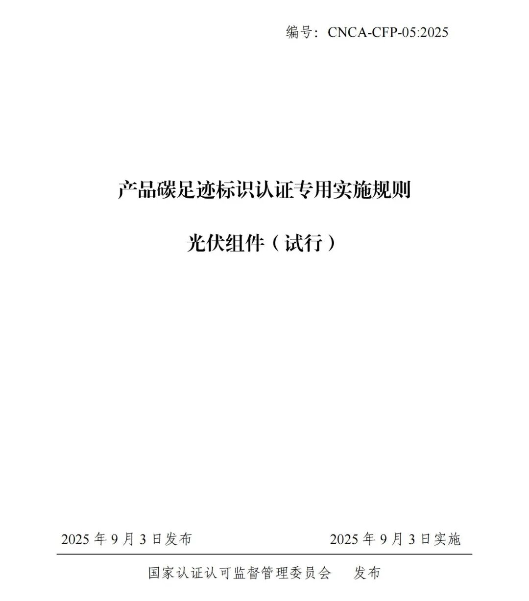 9月3日,国家认监委秘书处关于印发第一批产品碳足迹标识认证专用实施规则(试行)的通知,其中,包括产品碳足迹标识认证专用实施规则光伏组件(试行)。
