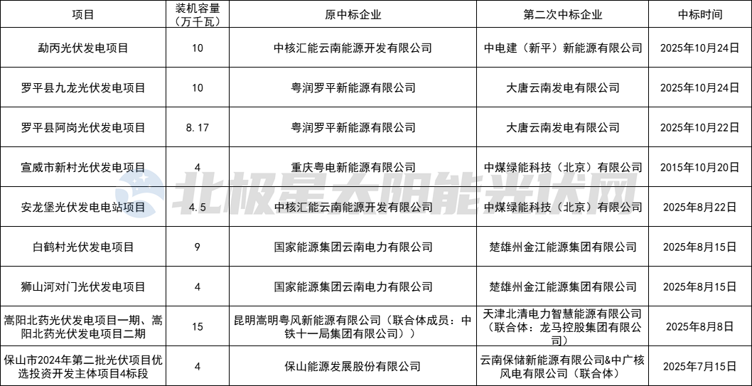 北极星跟踪公开信息统计,目前已有十余个光伏项目遭原中标业主放弃指标,其中又以云南省尤为集中,项目总规模超800MW,业主涉及中核、广东能源集团、国家能源集团、京能集团、中国能建等。