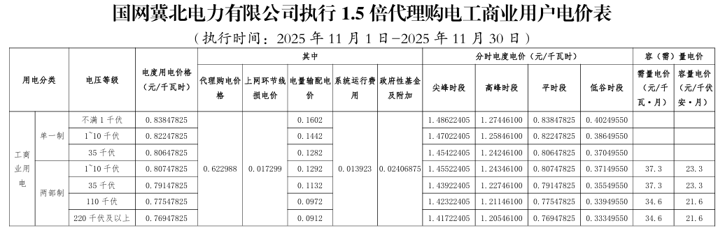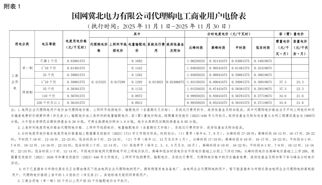 11月,河北将执行五段式电价,1.1481元/kWh的最高价差将有利于工商储实现峰谷套利,不过,10月16日,河北省发展和改革委员会发布《关于优化调整冀北电网工商业及其他用户分时电价政策的通知(征求意见稿)》,将于2026年1月1日起执行。《通知》提到,与现行相比,优化后的分时电价11月到次年1月增加12:00-15:00共3个小时的深谷时段;6-8月的尖峰时段向后平移了一个小时,由原先17:00-20:00改为18:00-21:00 ;2月-5月、9月-10月将8:00-10:00的原高峰时段改为平谷,取消了上午2小时高峰时段。调整后的分时电价在秋冬时段难以满足峰谷时段的两充两放,或将影响工商业储能投资回收期。