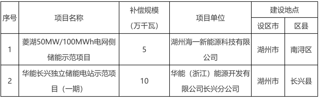 附:湖州市电网侧新型储能容量补偿项目清单