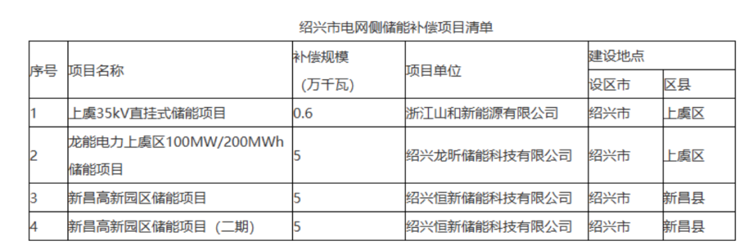 关于绍兴市电网侧新型储能容量补偿项目清单公示