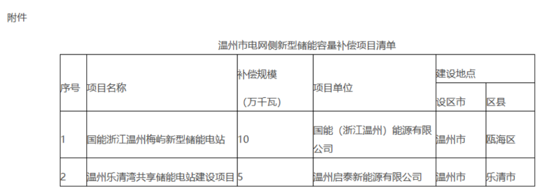 附件:温州市电网侧新型储能容量补偿项目清单