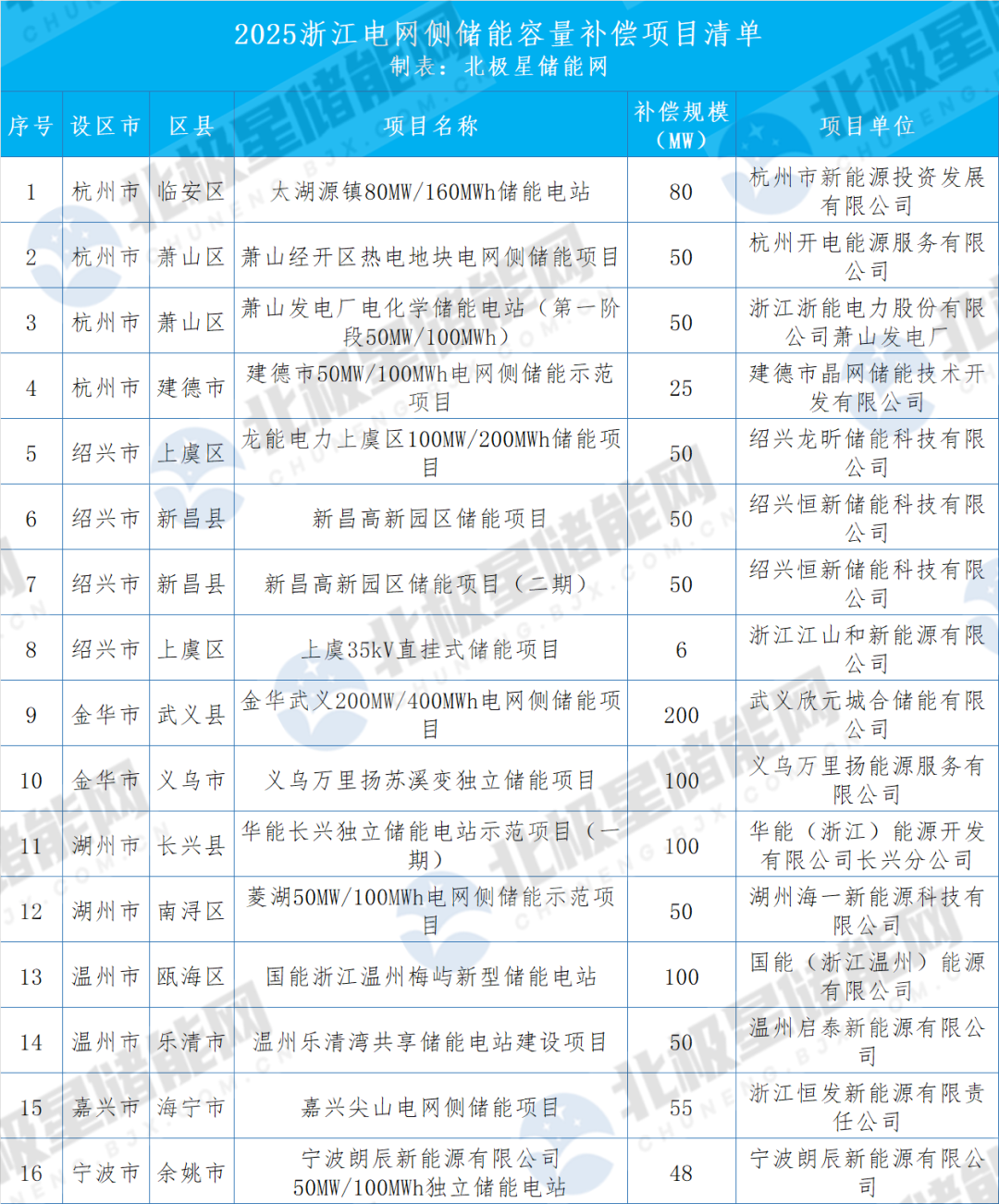 从目前公布清单来看,其中杭州和绍兴分别有4个储能项目纳入,补偿规模分别为205MW和156MW。金华、湖州、温州分别有2个储能项目进入清单,补偿规模分别为300MW、150MW、150MW,另外嘉兴和余姚分别有一个项目。