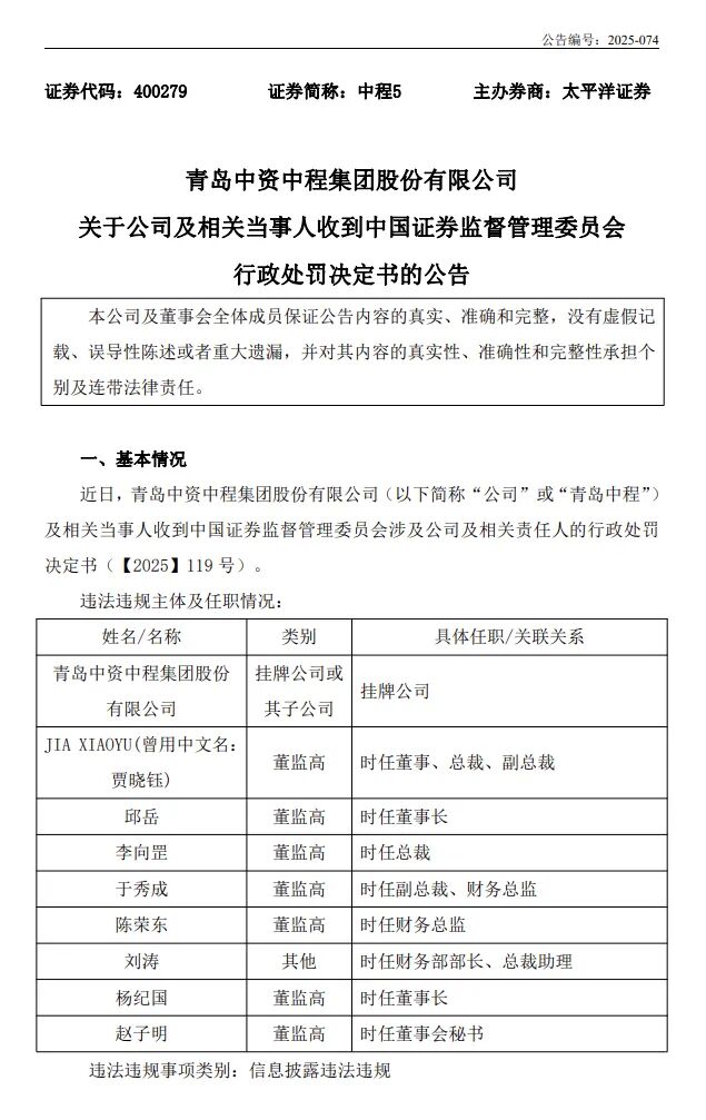10月31日,青岛中资中程集团股份有限公司(简称“青岛中程”)发布关于公司及相关当事人收到中国证券监督管理委员会行政处罚决定书的公告。