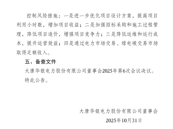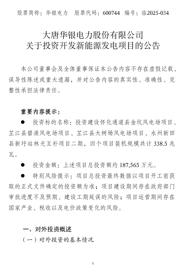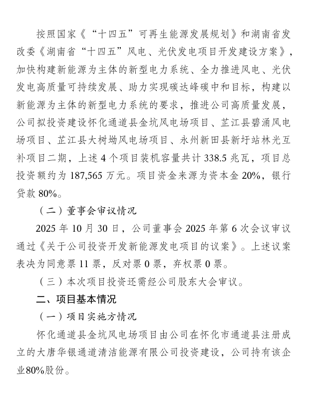 北极星风力发电网获悉,10月31日,大唐华银电力股份有限公司(以下简称“华银电力”)发布《关于投资开发新能源发电项目的公告》。