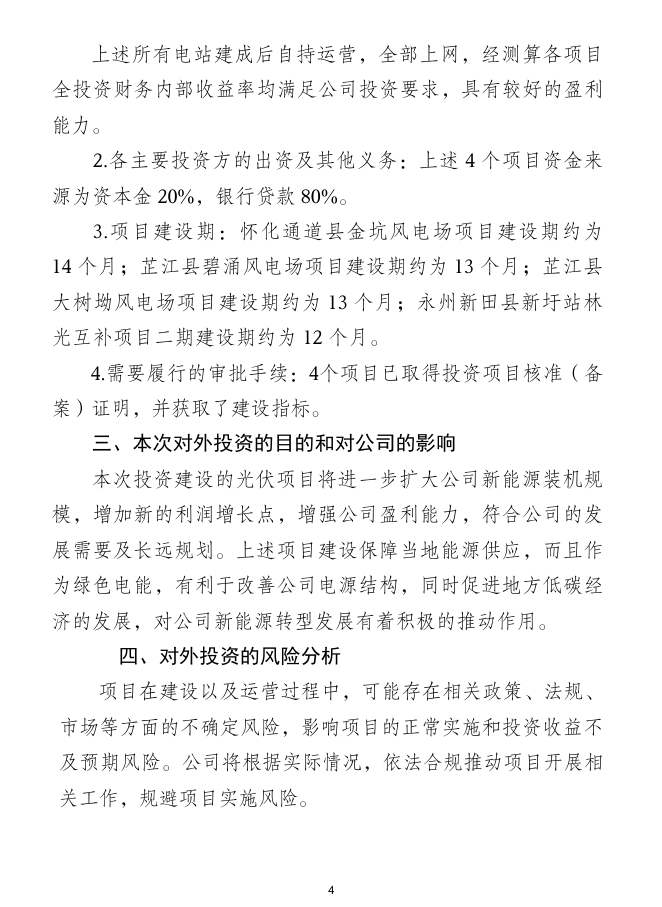 项目建设期:怀化通道县金坑风电场项目建设期约为 14 个月;芷江县碧涌风电场项目建设期约为13个月;芷江县 大树坳风电场项目建设期约为13个月;永州新田县新圩站林 光互补项目二期建设期约为12个月。