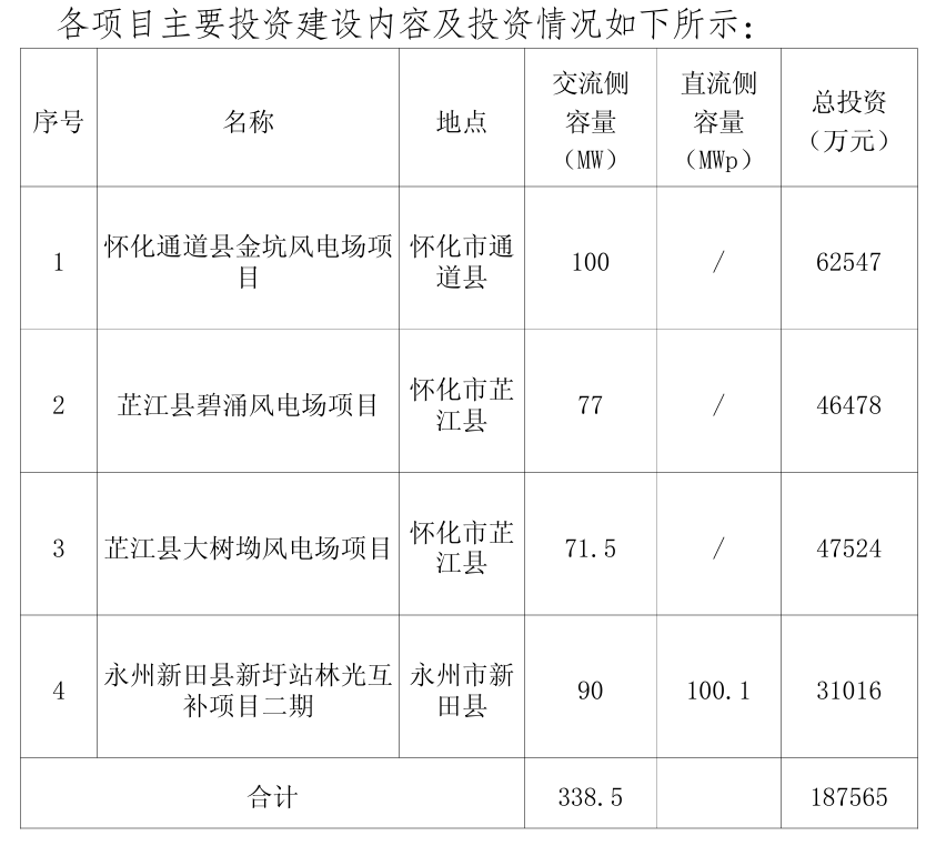 公告指出,华银电力拟投资建设怀化通道县金坑风电场项目、芷江县碧涌风电场项目、芷江县大树坳风电场项目、永州新田县新圩站林光互补项目二期,上述4个项目装机容量共计338.5兆瓦,项目总投资额约为187,565万元。其中风电项目总容量248.5MW,总投资金额156,549万元。