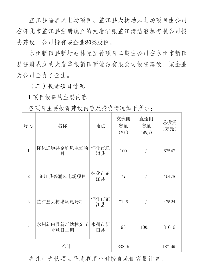 芷江县碧涌风电场项目、芷江县大树坳风电场项目由公司在怀化市芷江县注册成立的大唐华银芷江清洁能源有限公司投资建设。公司持有该企业80%股份。
