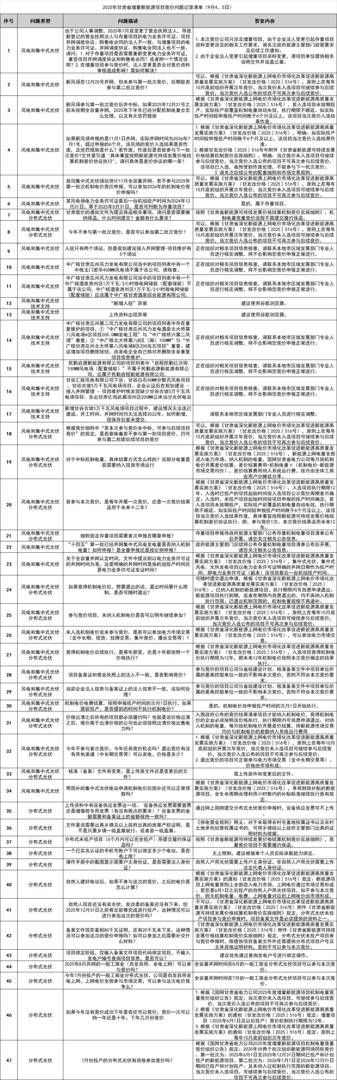 2025年甘肃省增量新能源项目竞价问题记录清单发布,更新至9月5日,累计47个问题,主要涉及风电和集中式光伏、分布式光伏等。