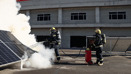 断电组使用绝缘剪断器剪断光伏板间的连接线,使每块光伏板之间相互独立,彻底降低系统电压。随后灭火组利用泡沫水枪直击火点,彻底扑灭明火。