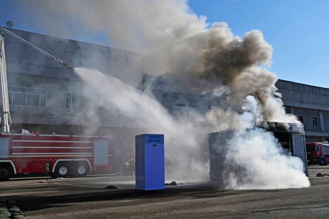 侦察组使用热像仪锁定起火模块,利用气体检测仪检测H₂、CO、HF浓度,警戒组划定警戒区域,在技术人员指导下手动启动储能站内部消防设施,并通过储能管理系统确认起火模块脱离电网。