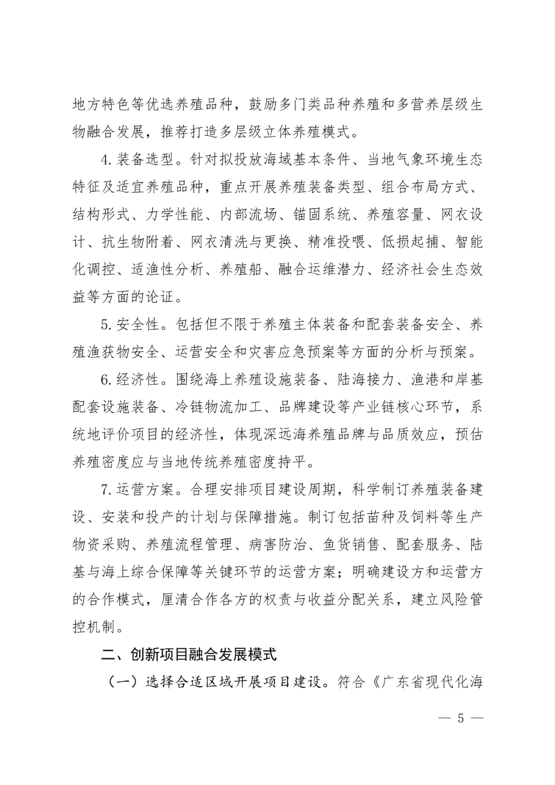 (一)选择合适区域开展项目建设。符合《广东省现代化海洋牧场发展总体规划(2024-2035年)》及有关规定的前提下,风电场址近岸包络线距最近渔港码头超过20海里的或者风电场址不适合开展养殖的,风电企业应结合实际,按照现代化海洋牧场配套建设要求或承诺的建设规模,出资在其他合适海域以重力式深水网箱、新型蚝排等为主开展建设。