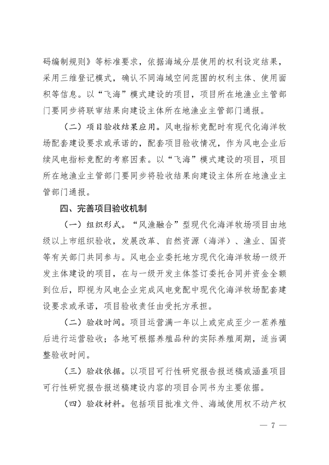 在完善项目验收机制中的组织形式上指出:“风渔融合”型现代化海洋牧场项目由地级以上市组织验收,发展改革、自然资源(海洋)、渔业、国资等有关部门共同参与。风电企业委托地方现代化海洋牧场一级开发主体建设的项目,在与一级开发主体签订委托合同并资金全额到位后,即视为风电企业完成风电竞配中现代化海洋牧场配套建设要求或承诺,项目验收责任由受托方承担。