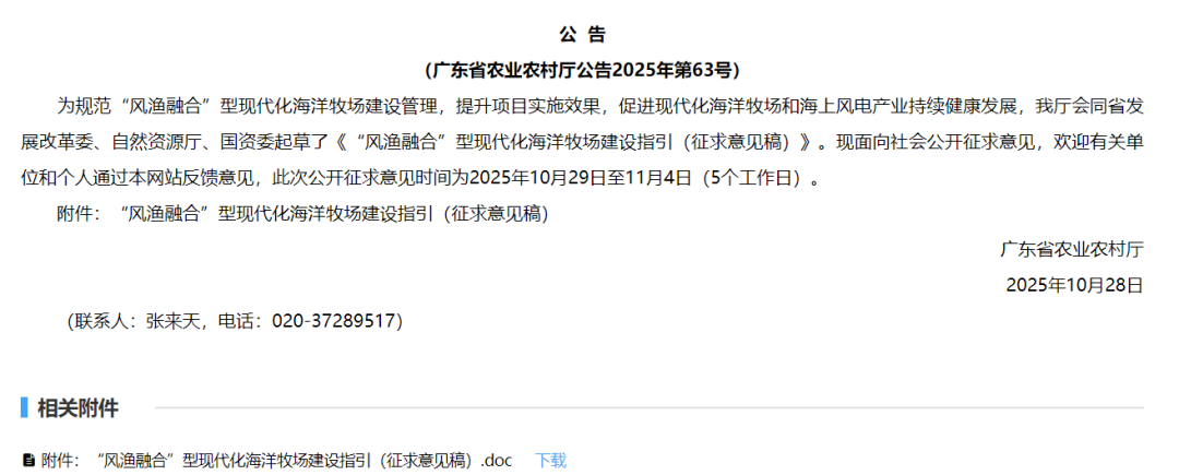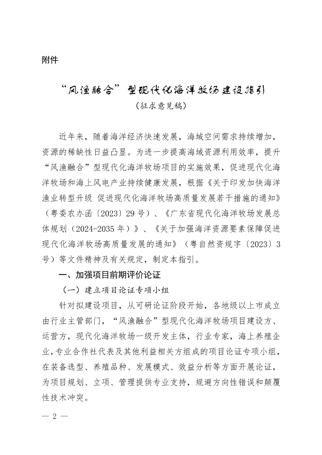 北极星风力发电网获悉,近日,广东省农业信息厅发布关于公开征求《“风渔融合”型现代化海洋牧场建设指引(征求意见稿)》意见的公告。公告在加强项目前期评价论证、创新项目融合发展模式、优化项目并联审批流程、完善项目验收机制和有关要求等五方面做出了明确部署。