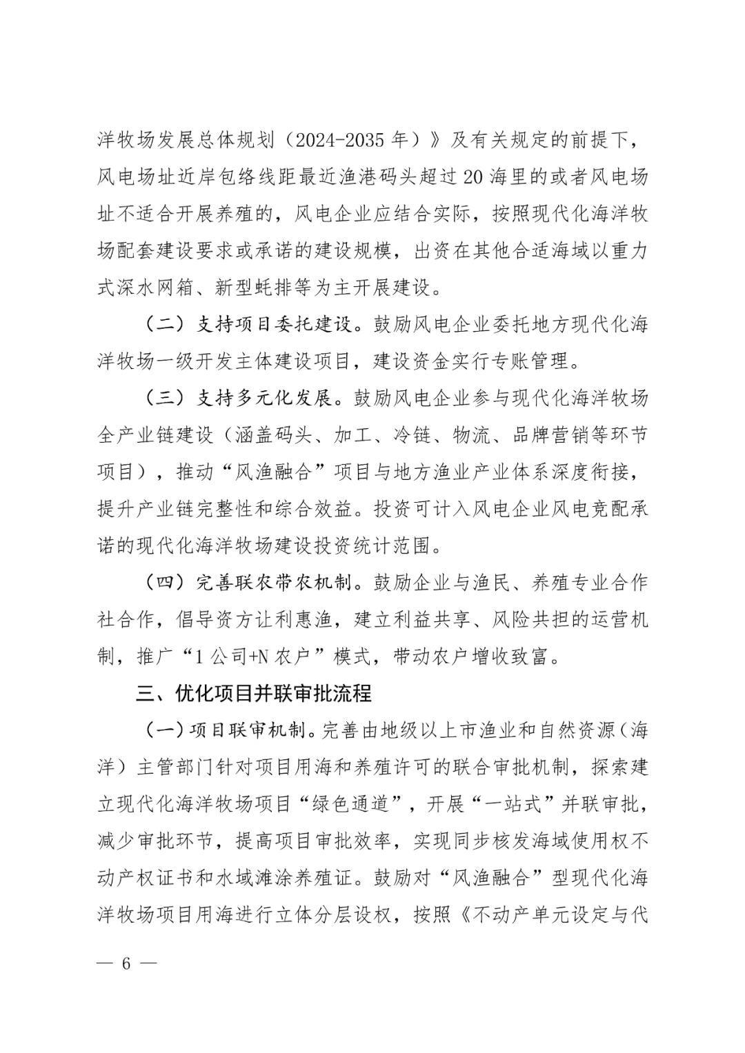 (三)支持多元化发展。鼓励风电企业参与现代化海洋牧场全产业链建设(涵盖码头、加工、冷链、物流、品牌营销等环节项目),推动“风渔融合”项目与地方渔业产业体系深度衔接,提升产业链完整性和综合效益。投资可计入风电企业风电竞配承诺的现代化海洋牧场建设投资统计范围。