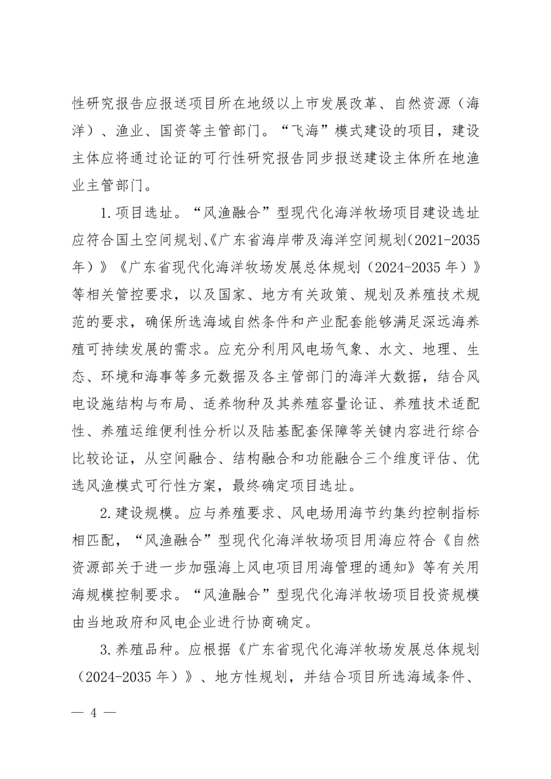 在组织项目论证方面指出:建设规模应与养殖要求、风电场用海节约集约控制指标相匹配,“风渔融合”型现代化海洋牧场项目用海应符合《自然资源部关于进一步加强海上风电项目用海管理的通知》等有关用海规模控制要求。“风渔融合”型现代化海洋牧场项目投资规模由当地政府和风电企业进行协商确定。