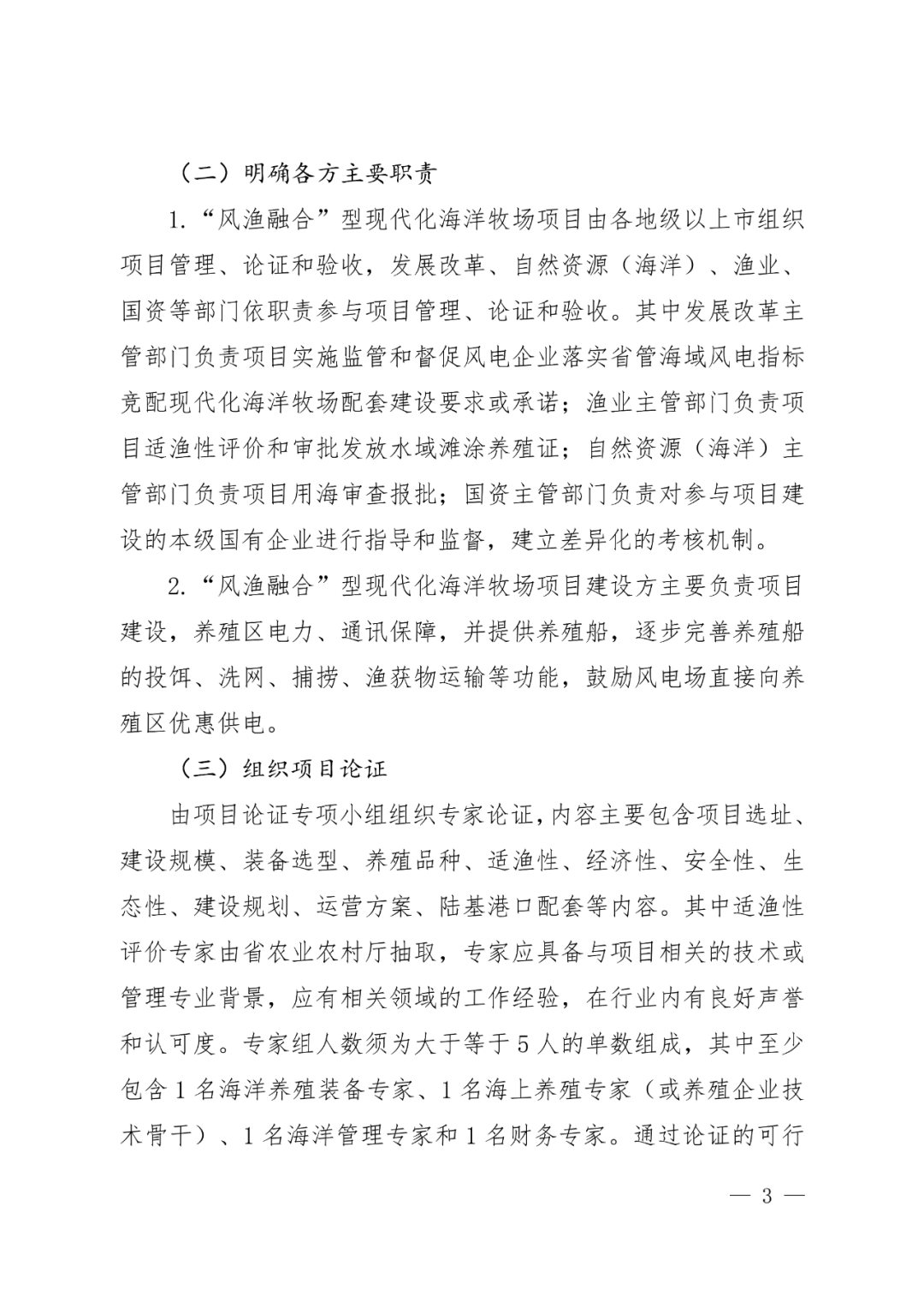 在明确各方主要职责方面指出:“风渔融合”型现代化海洋牧场项目建设方主要负责项目建设,养殖区电力、通讯保障,并提供养殖船,逐步完善养殖船的投饵、洗网、捕捞、渔获物运输等功能,鼓励风电场直接向养殖区伏惠供申。