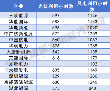 发电量方面,北极星统计的11家企业中,除龙源电力、湖北能源、中国核电和大唐新能源外,其余企业的风电发电量均超过光伏。核心原因在于发电利用小时数差异显著—— 所统计的13家企业中,光伏发电利用小时数几乎不足风电的一半,直接导致发电量差距拉大。