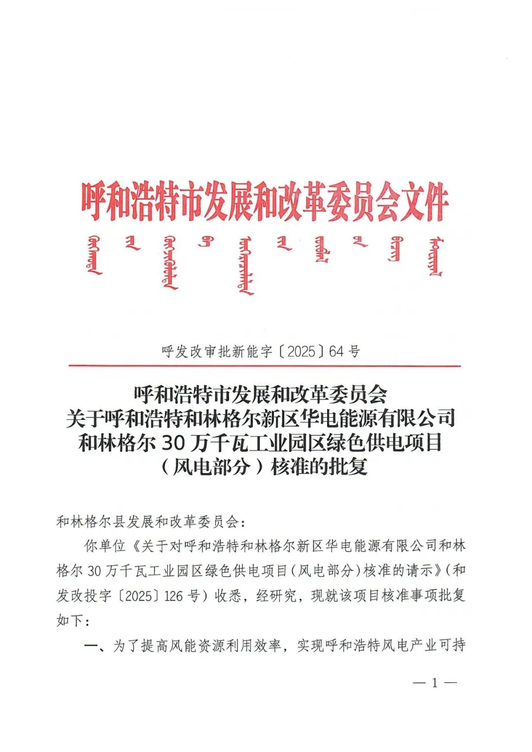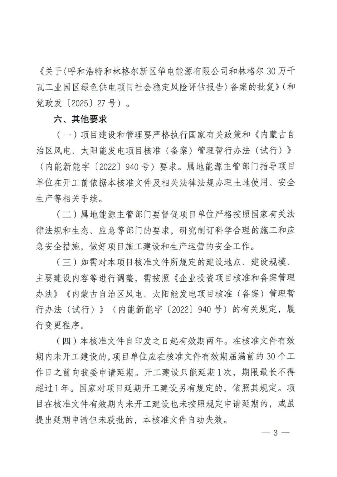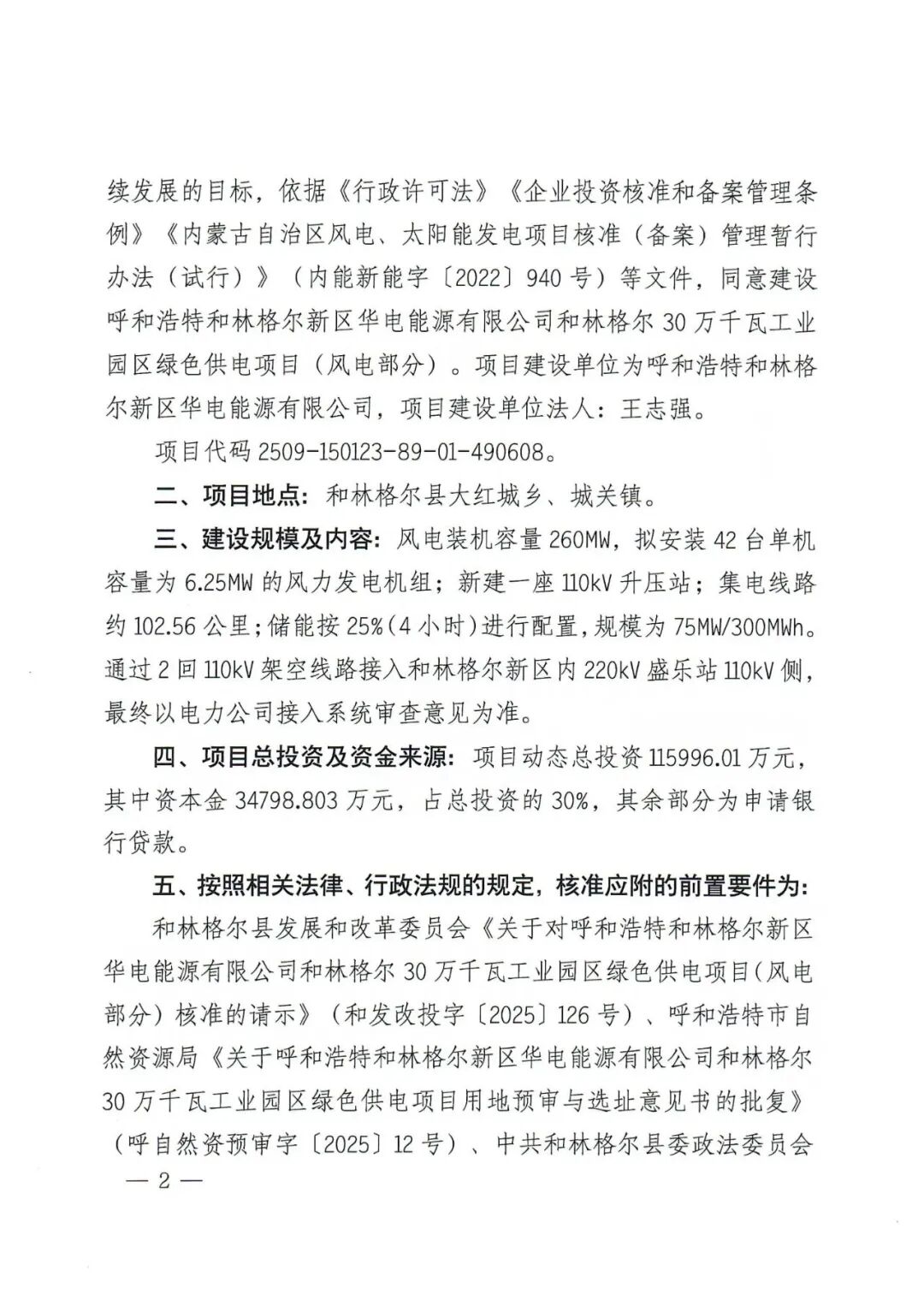 呼和浩特和林格尔新区华电能源有限公司和林格尔30万千瓦工业园区绿色供电项目(风电部分)位于和林格尔县大红城乡、城关镇,风电装机容量260MW,拟安装42台单机容量为6.25MW的风力发电机组,储能按25%(4小时)进行配置,规模为75MW/300MWh。项目动态总投资115996.01万元,项目建设单位为呼和浩特和林格尔新区华电能源有限公司。