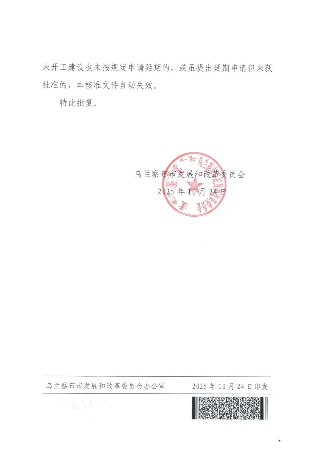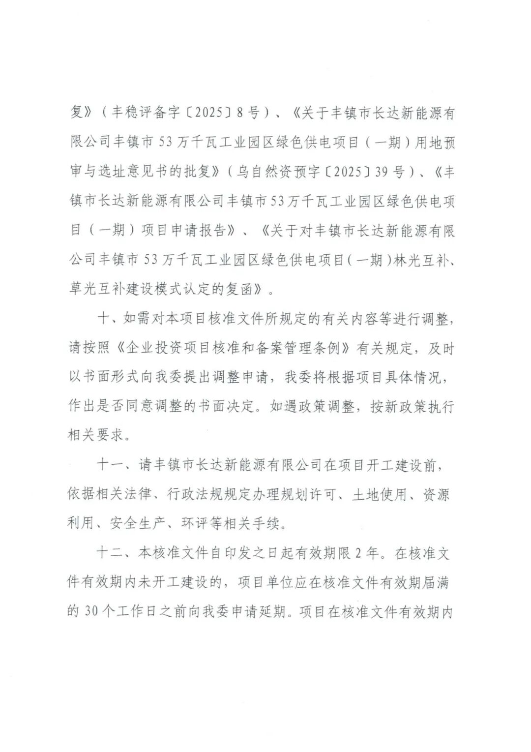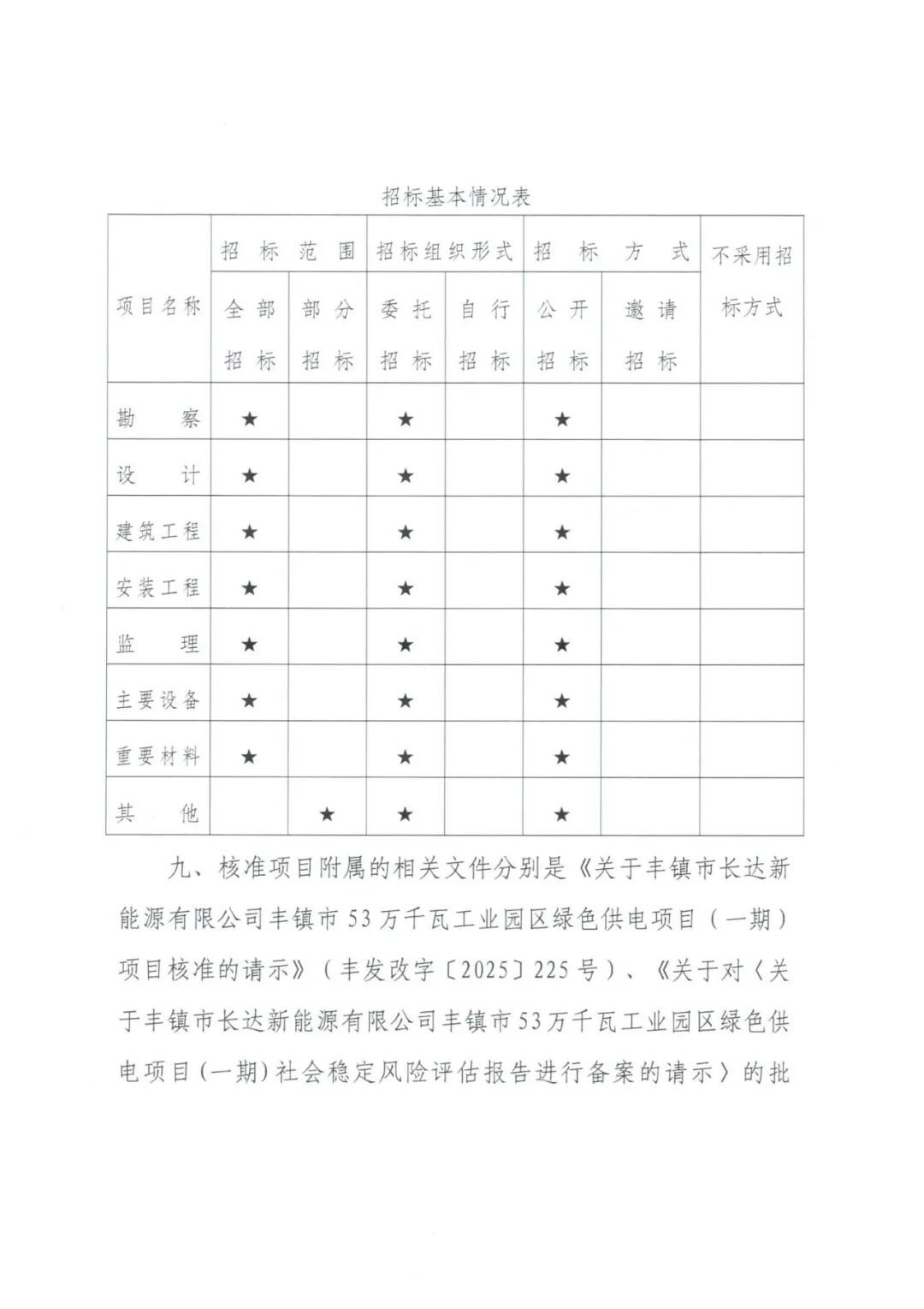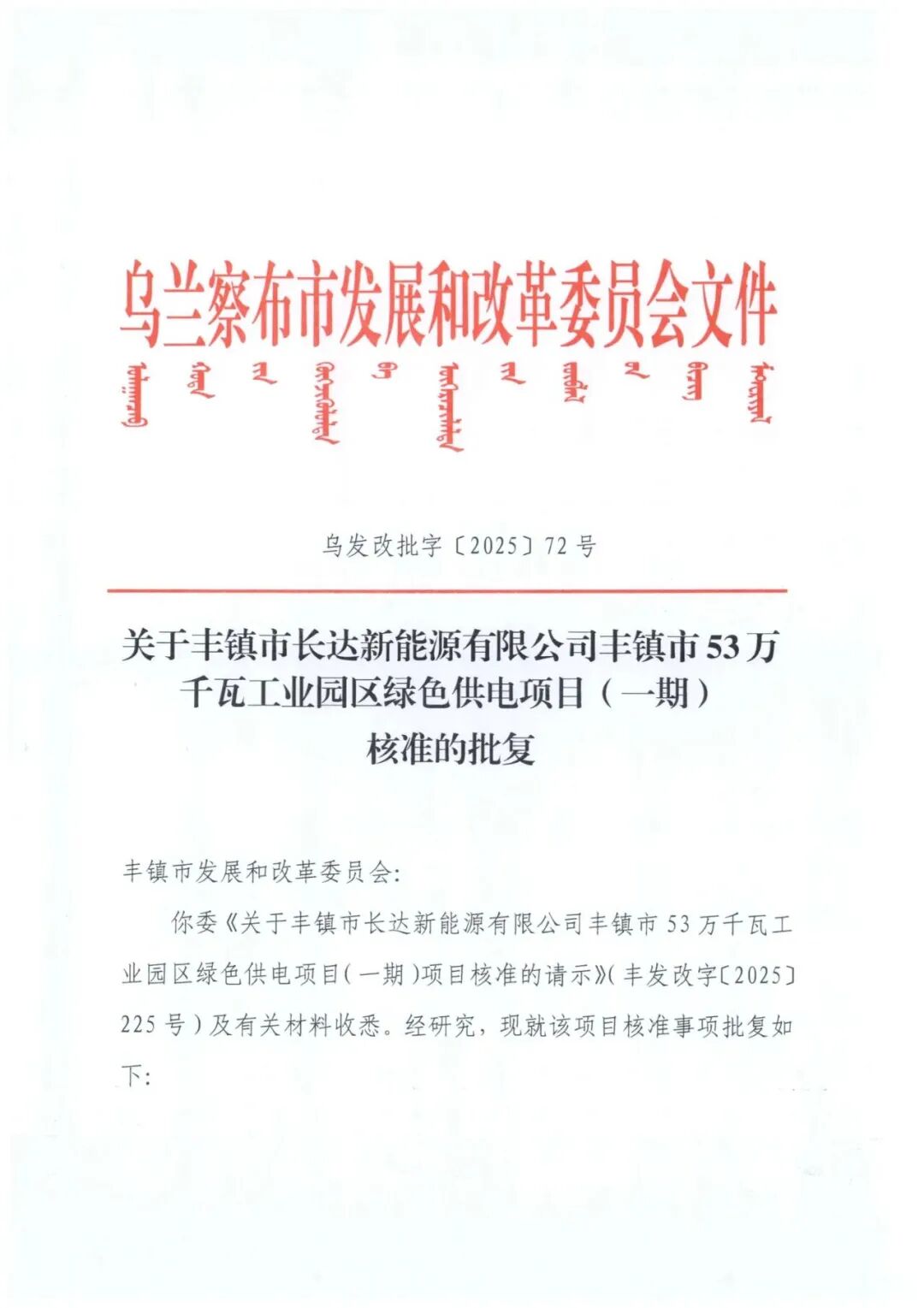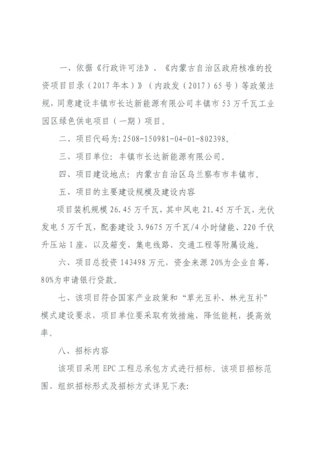 其中,丰镇市长达新能源有限公司丰镇市53万千瓦工业园区绿色供电项目(一期)位于内蒙古自治区乌兰察布市丰镇市,项目装机规模26.45万千瓦,其中风电21.45万千瓦,光伏发电5万千瓦,配套建设3.9675万千瓦/4小时储能。项目总投资143498万元,项目单位为丰镇市长达新能源有限公司。