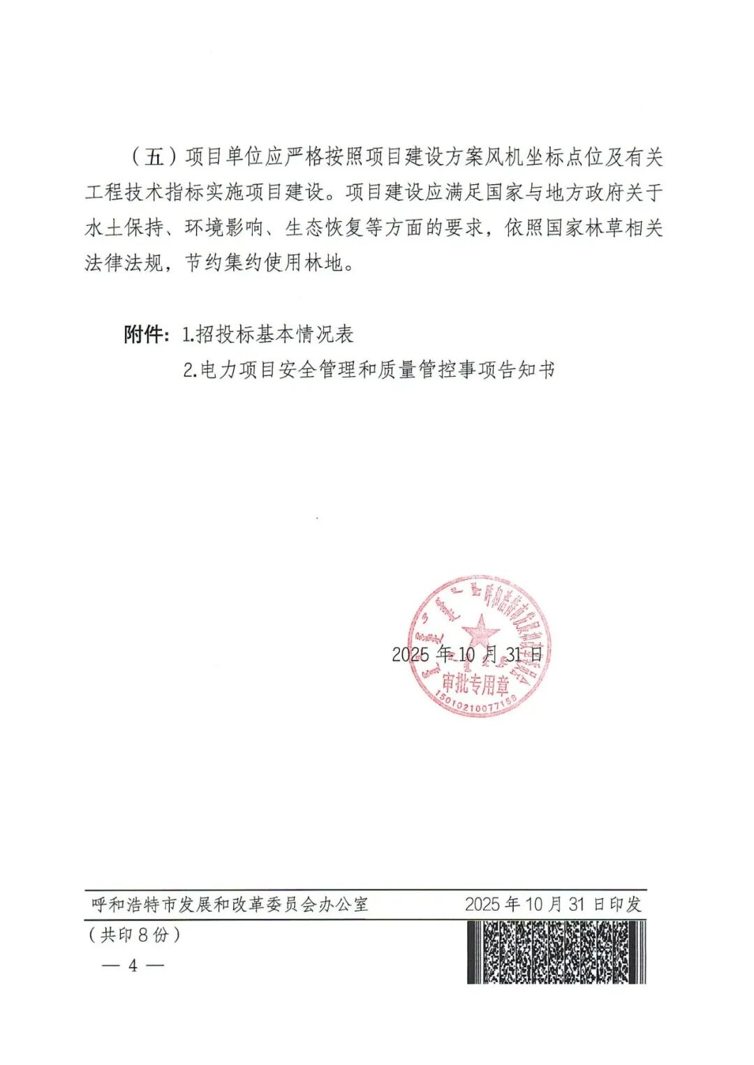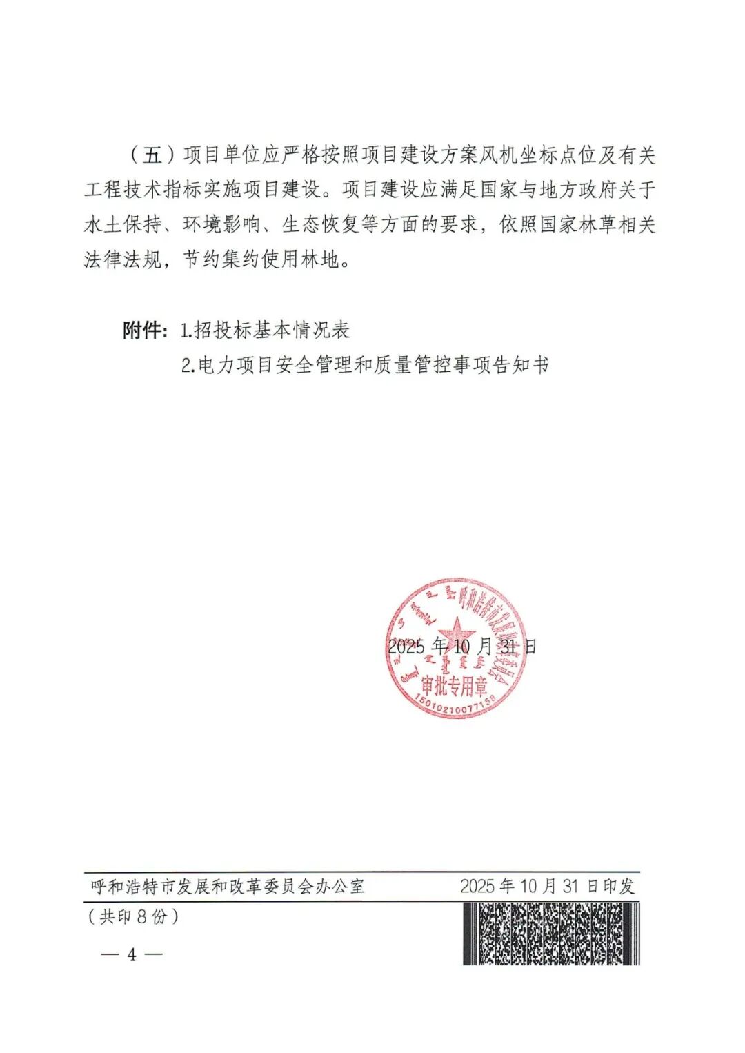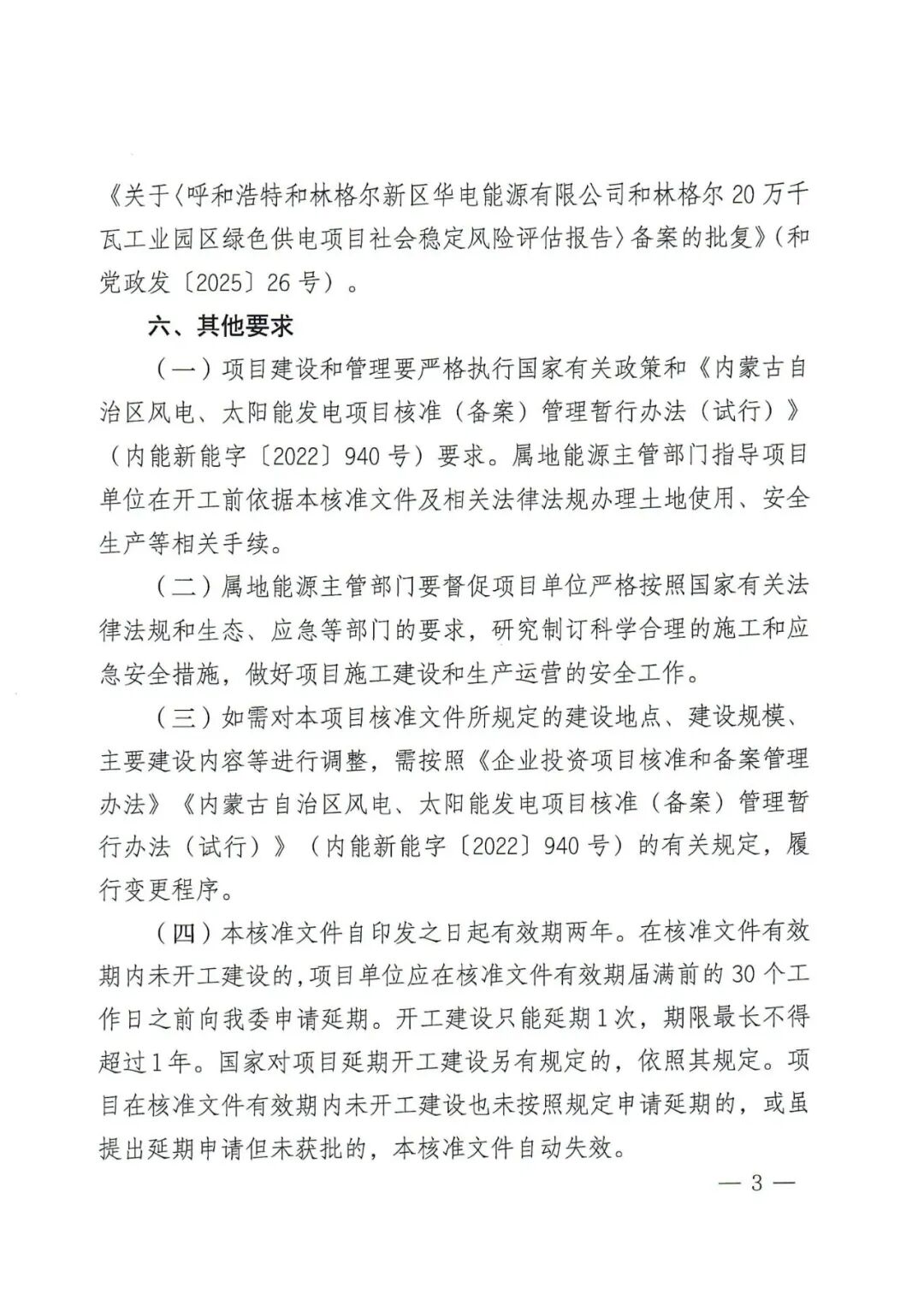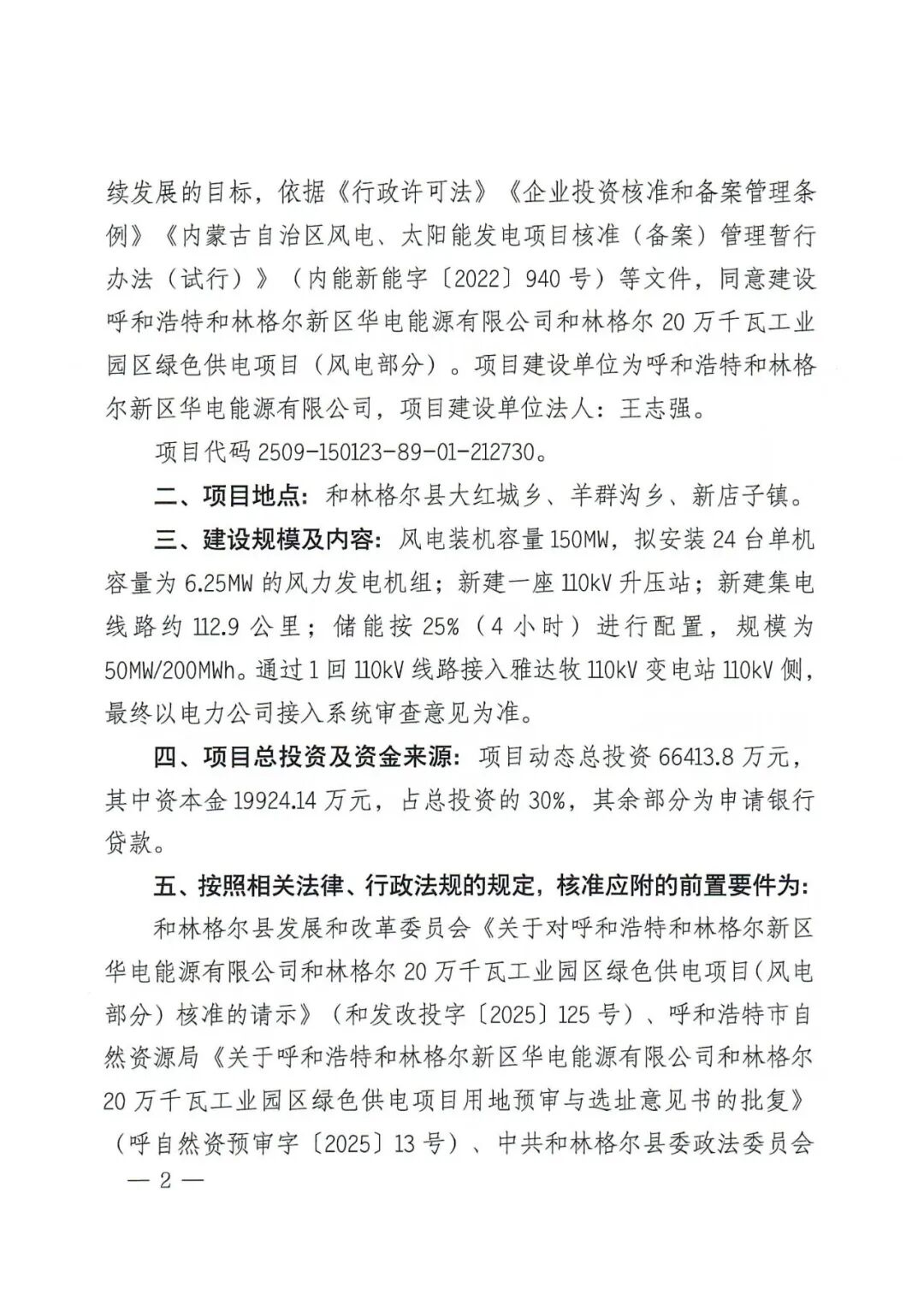呼和浩特和林格尔新区华电能源有限公司和林格尔20万千瓦工业园区绿色供电项目(风电部分)位于和林格尔县大红城乡、羊群沟乡、新店子镇,风电装机容量150MW,拟安装24台单机容量为6.25MW的风力发电机组,储能按25%(4小时)进行配置,规模为50MW/200MWh。项目动态总投资66413.8万元,项目建设单位为呼和浩特和林格尔新区华电能源有限公司。