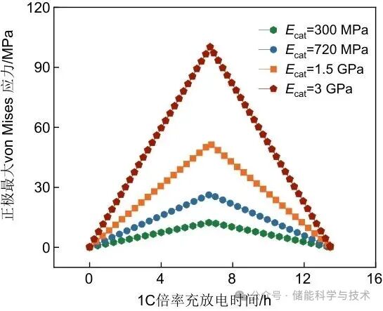 电池体积变化与组件的应力状态密切相关。由于电池形变主要来自正极,因此本工作进一步探讨了正极应力的演变,结果如图9所示。整个正极区域的最大σMises,在较大的Ecat下更高,并且在充电结束时达到峰值。当Ecat分别为300 MPa、720 MPa、1.5 GPa和3 GPa时,最大σMises分别为12.5 MPa、26.48 MPa、51.9 MPa和100.2 MPa。这表明,采用较低杨氏模量的正极材料,在巨大的负极膨胀下更容易发生弹性形变,从而在有限的空间内缓解电池整体的膨胀应力。