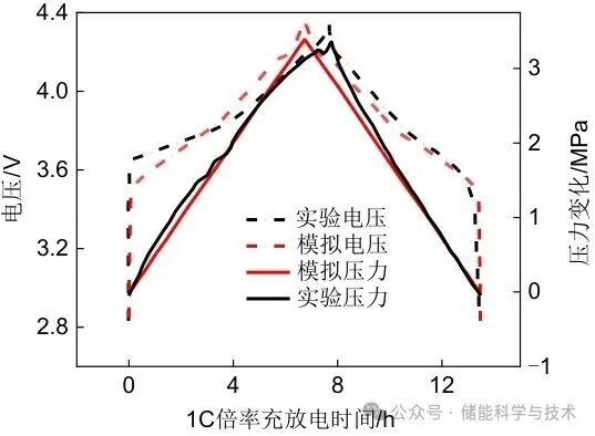 为了验证电化学-力学耦合模型的有效性,模拟了电池完整的第一次循环充放电电压-压力响应,并提取了堆叠压力下正负极两端的压力平均值,将ASSLMBs的模拟电压响应和堆叠压力变化与实验结果进行了对比,如图3所示。模拟的充放电电压曲线与实验曲线一致,且模型很好地描述了充放电过程中的堆叠压力变化,从而验证了所建模型的有效性。因此,该模型能够在实际运行条件下准确预测全固态锂电池的电化学-力学耦合行为。在充电过程中,电压和压力均增加,而在转为放电时,电压和压力均减小,表明了电化学与力学之间的联系。