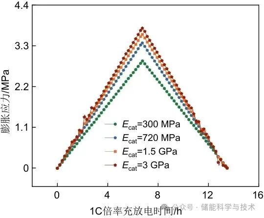 在电池循环过程中,由于锂离子的反复嵌入和脱出,正极区域会发生体积收缩和膨胀,为了探究正极杨氏模量对ASSLMBs充放电过程中膨胀应力的影响,将模型上下两端固定,限制电池的膨胀空间。基于文献[34],图7给出了正极杨氏模量Ecat=300 MPa、720 MPa(基线)、1.5 GPa和3 GPa状态下的膨胀应力变化曲线。可以看出,电池的边界初始膨胀应力从0增加到充电结束时的峰值,然后在放电过程中逐渐减小。在较低的正极杨氏模量下,ASSLMBs边界探测到的膨胀应力更小。当Ecat从300 MPa增加到720 MPa时,膨胀应力的峰值也随之增加,从2.89 MPa上升到3.38 MPa,这表明降低Ecat能够减少电池的整体膨胀应力变化。