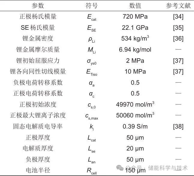 该模型参数聚焦于固相锂离子扩散机制与应力-应变耦合关系,其参数设置见表1。