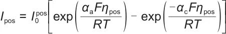 是交换电流密度;T是热力学温度;F是法拉第常数;R是气体常数;αa和αc分别是负极和正极区域的电荷转移系数;ηpos是界面过电位,表示为式(2)。