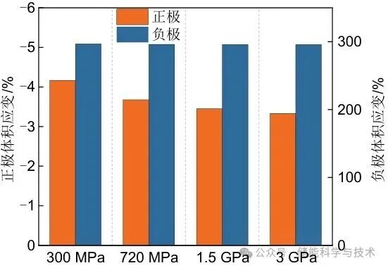 图8给出了电池正负极在充放电过程中的最大体积应变,锂负极的体积应变εᵥ在不同Ecat下保持一致,其最大εᵥ达到296%,表明改变Ecat对电池体积变化的影响并非来自负极一侧。由于SE的体积压缩量很小(<0.04%),因此不讨论SE区域。从不同Ecat下正极体积应变的分布图可以看出,较低的Ecat会导致更显著的体积变化。当Ecat=300 MPa时,正极最大体积收缩为-4.2%,而当Ecat=3 GPa时,收缩减少到-3.3%。结果表明,具有较低Ecat的正极能够有效吸收负极区域的体积膨胀。