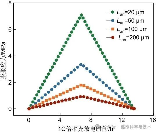 图10给出了不同锂金属负极厚度下膨胀应力变化。在基线厚度Lan=50 μm时,膨胀应力的最大值约为3.4 MPa,超过了锂金属的屈服强度(σys0=2 MPa),表明锂负极进入了塑性形变阶段。将Lan减小到20 μm,最大膨胀应力增加到7.1 MPa。当Lan增加到100 μm和200 μm时,最大膨胀应力分别降低到1.81 MPa和0.94 MPa。结果表明,随着锂负极厚度的增加,膨胀应力呈现出显著下降的趋势。