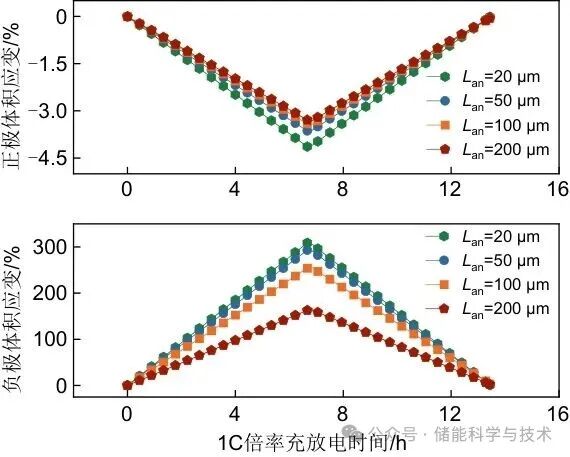 由SE-负极界面处的锂沉积引起的巨大体积应变可以通过锂金属的形变来减轻。从式(20)和式(21)分析得出,随着Lan的增加,负极的体积应变逐渐减小。减小锂负极的厚度可进一步提高ASSLMBs能量密度,但结果展示了增加负极厚度可以减小电池体积应变和膨胀应力。因此,在锂负极厚度方面,需要在高能量密度和低膨胀应力之间取得平衡。