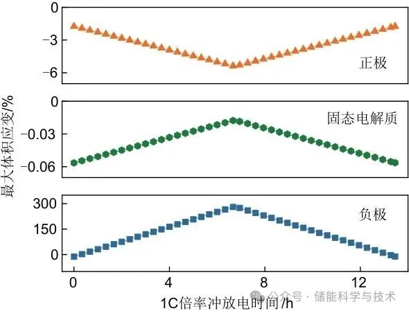 图4 1C倍率下充放电过程中正极、SE和负极的最大体积应变