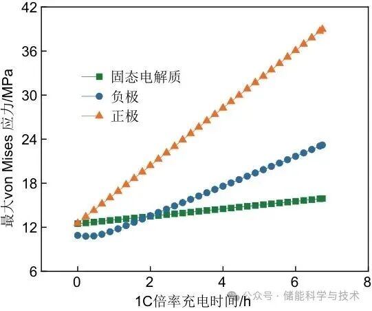 图6给出了充电过程中SE、正负极的最大von Mises应力,在12.5 MPa的堆叠压力下,正极、SE和负极区域的平均σMises应力分别为12.5 MPa、12.55 MPa和10.9 MPa,其微小差异可以通过各组件材料的不同力学性能(例如杨氏模量、屈服强度)来解释[40]。一旦充电过程开始,ASSLMBs整体体积的增加受到外部机械约束(即堆叠压力)的影响,导致电池组件的内部应力增加。