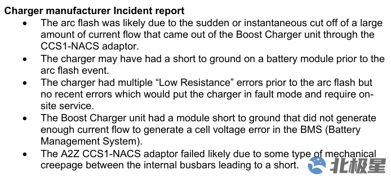 事故调查报告指出,电弧闪爆可能是由于CCS1-NACS适配器从增压充电器单元流出的大量电流突然切断造成的。但是在电弧闪光事件发生之前,充电器内部的电池模块可能已经对地短路。增压充电桩模块对地短路,因此无法产生足够的电流,进而无法在BMS(电池管理系统)中显示电池电压错误提示。而A2Z CCS1-NACS适配器之所以发生故障,可能是由于内部母线之间的某种机械漏电导致短路。
