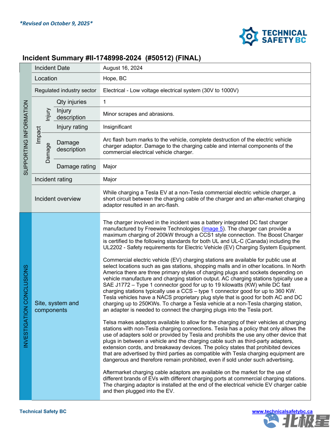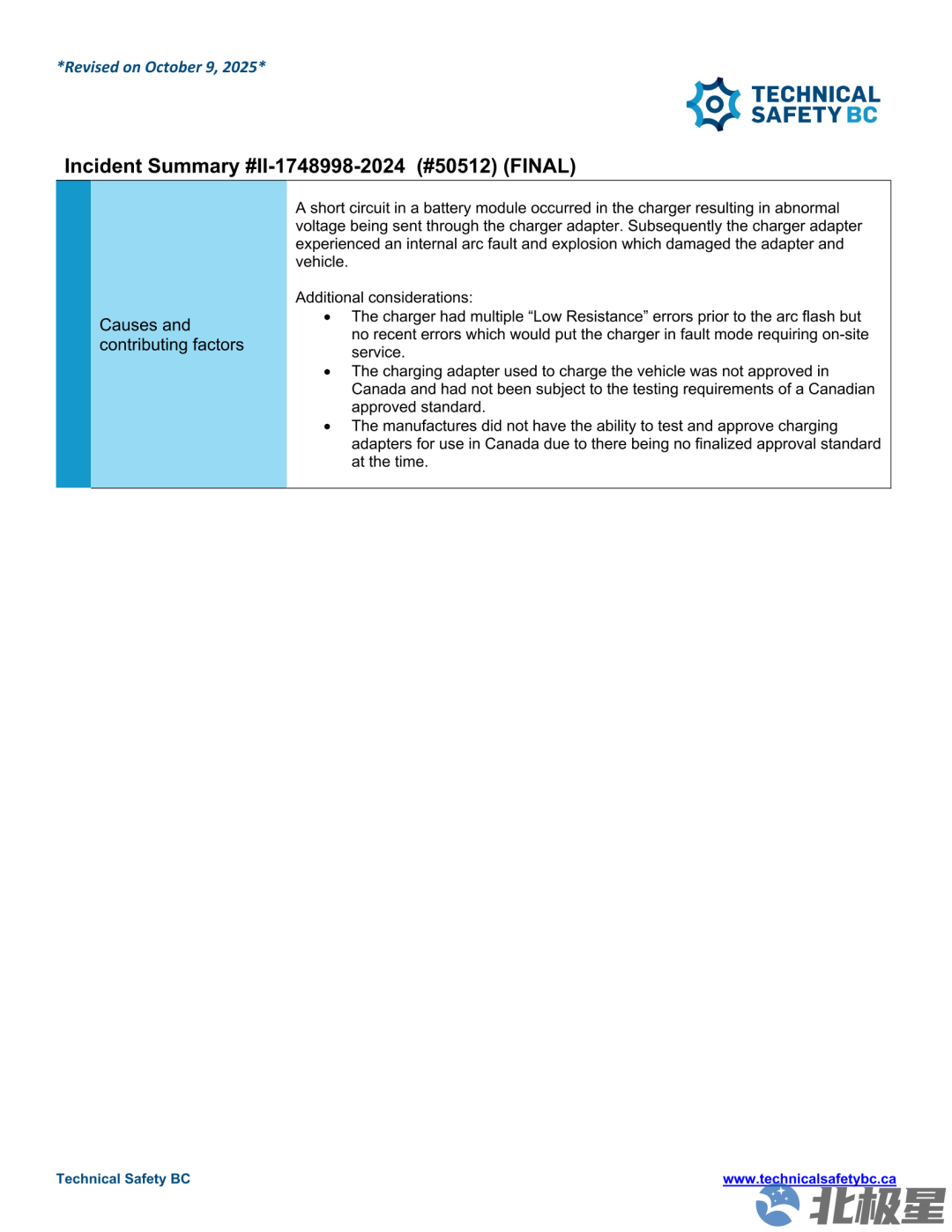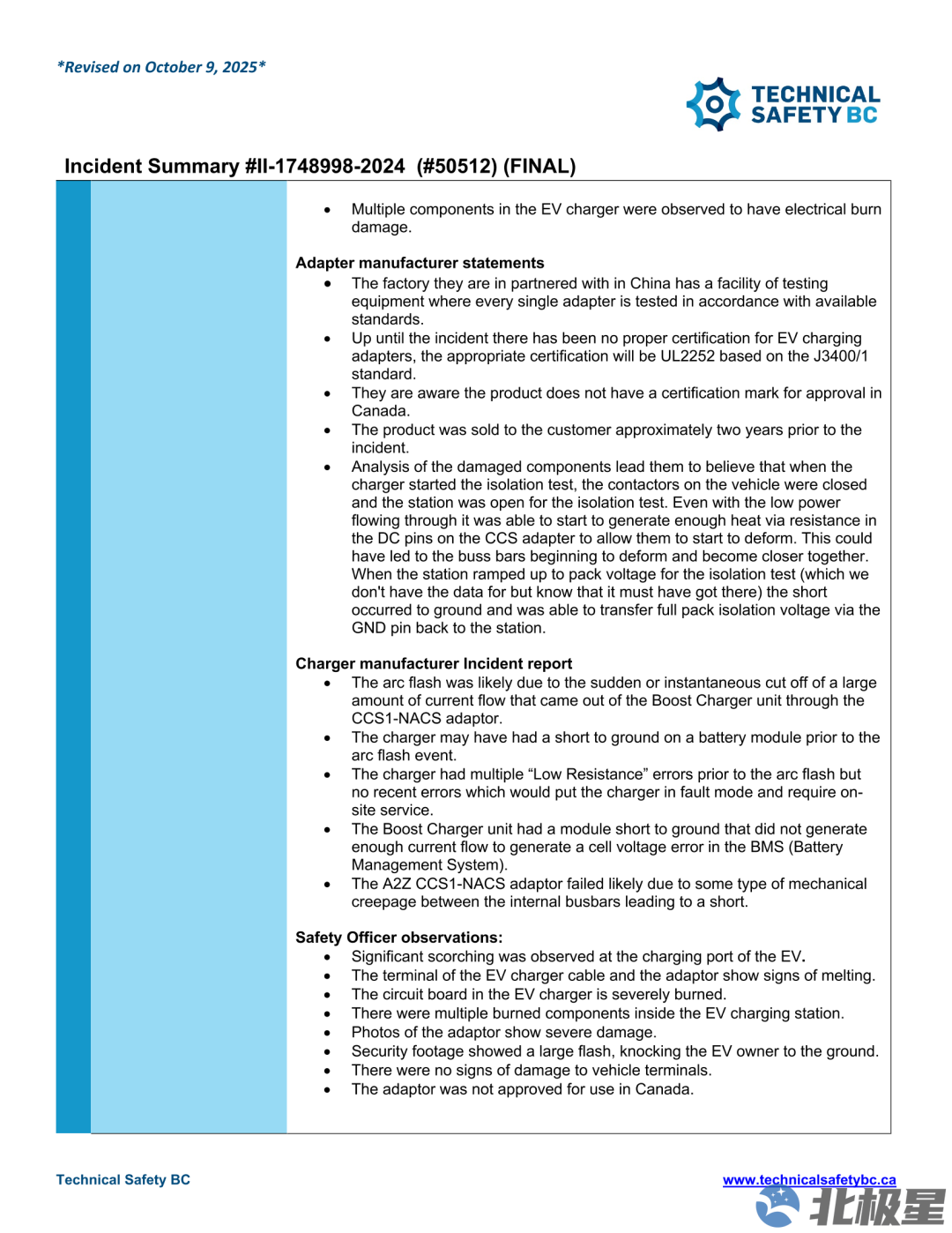 BC安全技术局调查报告显示,事故所用的充电桩内部电池模块发生短路,导致异常电压通过充电线缆传输。当异常电压到达连接的适配器时,最终引发了电弧闪光爆炸。尽管适配器在事故中损毁,但报告明确指出,引发故障的源头是充电桩本身。
