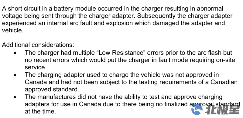 但是报告总结指出,充电器中的电池模块发生短路,导致通过充电器适配器发送异常电压。随后,充电器适配器发生内部电弧故障和爆炸,损坏了适配器和车辆。