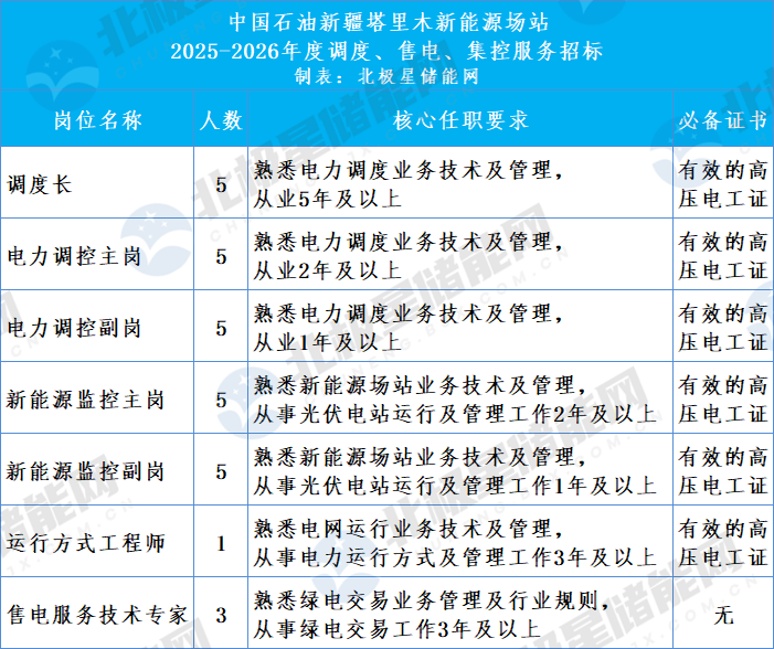 北极星储能网讯:2025年11月6日,中国石油塔里木油田新能源事业部发布2025-2026年度调度、售电、集控招标,文件要求拟投入技术服务人员不少于29人,均需具有大专及以上学历。具体岗位岗位职责可参考文末招标文件。