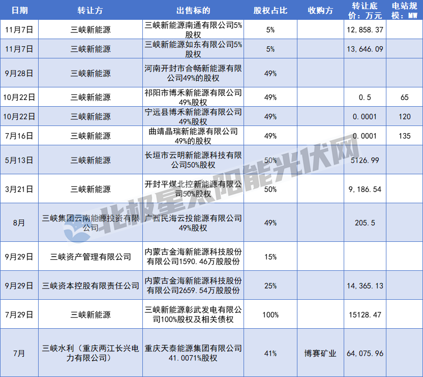 三峡集团同样密集出售新能源资产,转让标的总价超13亿元。其中交易金额最大的,是三峡水利以6.4亿元向博赛矿业出售重庆天泰能源集团有限公司41.0071%股权;三峡新能源共出售9家新能源公司股权,包含与晶澳、禾望等合资公司股权;三峡集团云南能源投资有限公司出售广西民海云投能源有限公司49%股权,定价205.5万元。