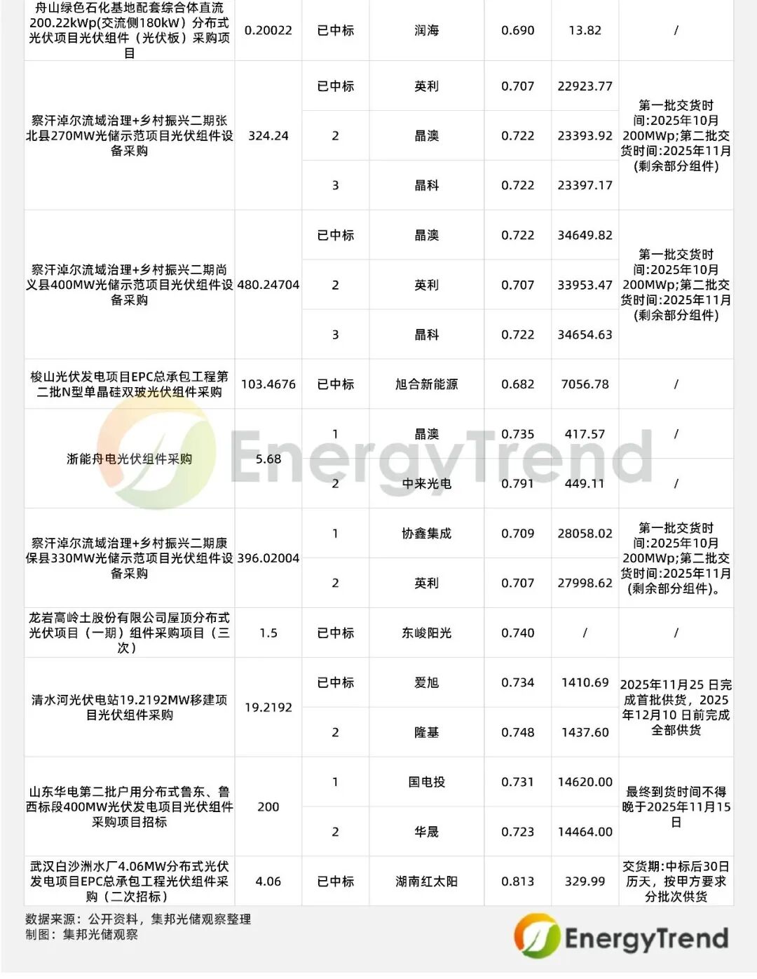 据集邦光储观察不完全统计,2025年10月光伏组件已公布中标结果及中标候选人的规模达3.06GW,含已定标规模2.46GW,第一中标候选人规模0.6GW。